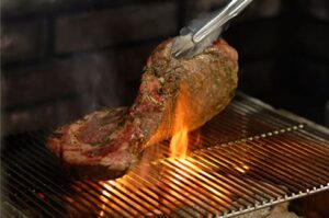 オープンキッチンでは、お客様の目の前で、薪の直火で焼いたステーキや、無農薬で育てた稲藁を蒸し上げ香りづけした品など、旨みを閉じ込めながらお肉を丁寧に焼き上げています。