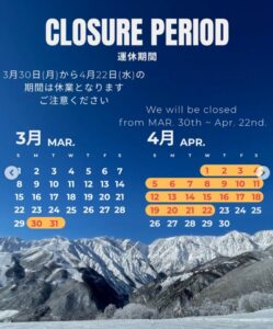 - 準備休業期間: 2026年3月30日(月)~ 4月22日(水)